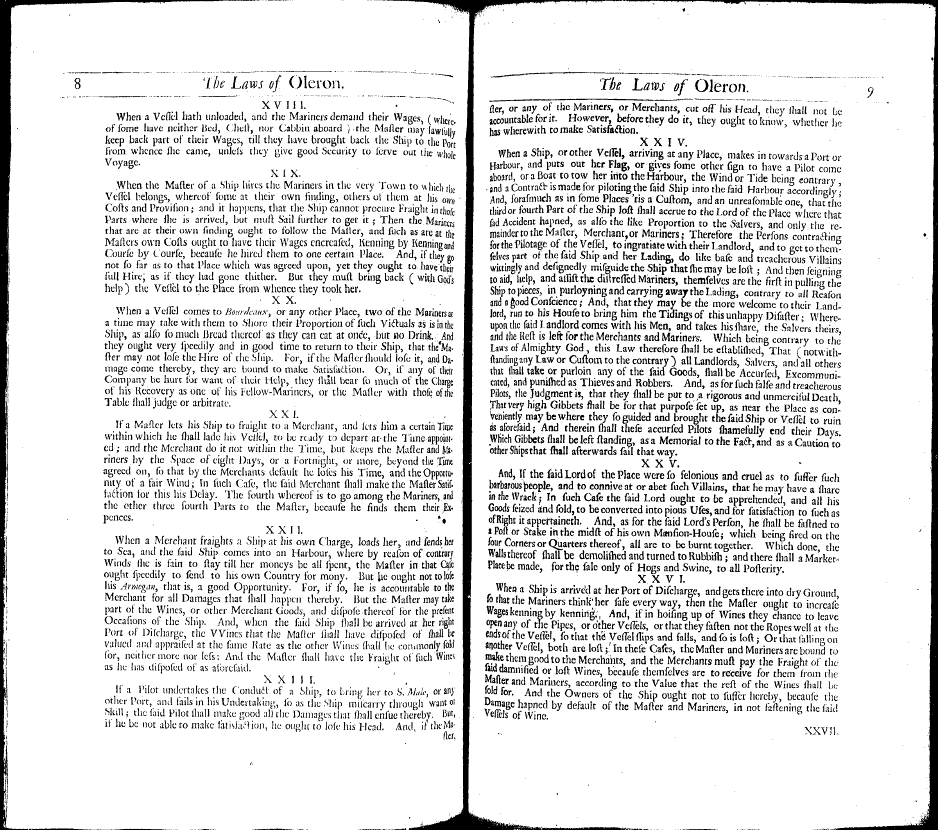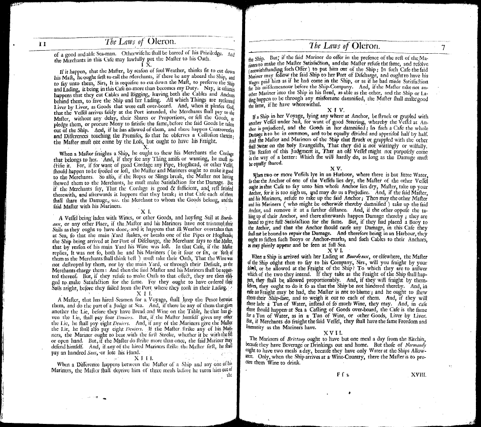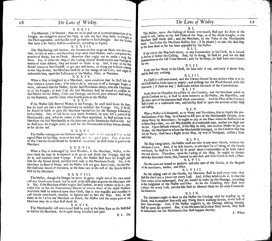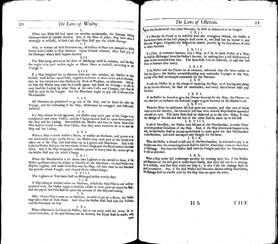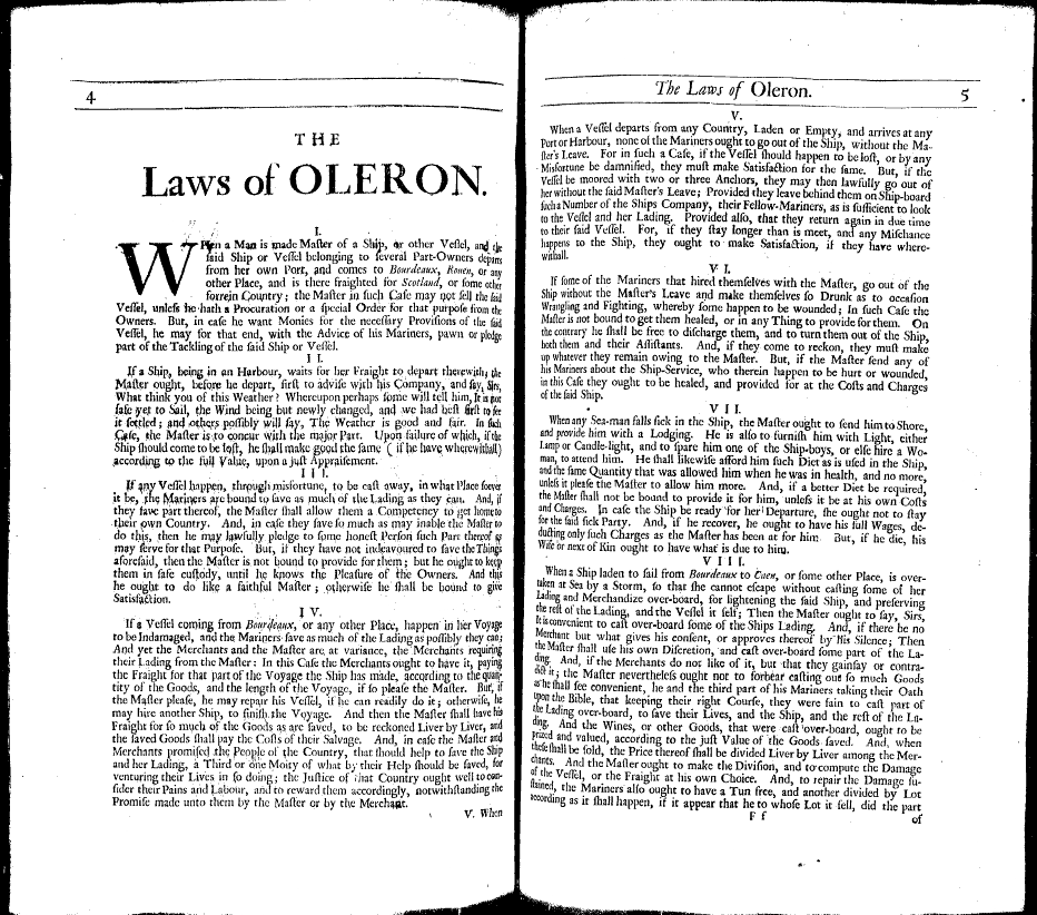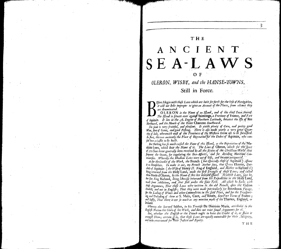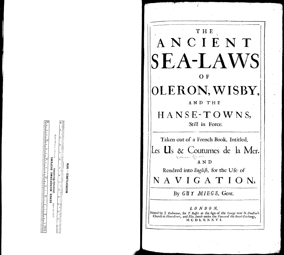 Cleirac, Estine. The Ancient Sea-Laws of Oleron, Visby, and the Hanse-Towns, Still in Force. Translated by Guy Miege. London: J. Redmayne, 1686.