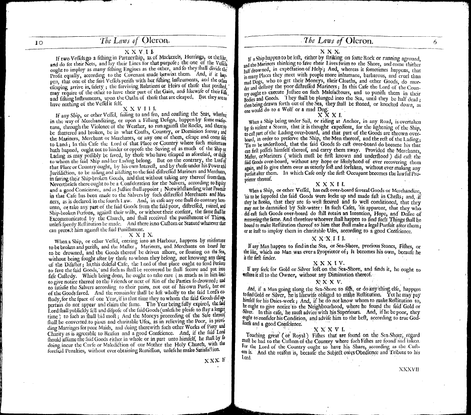 But nothing has so much raised the Fame of this Island, as the Reputation of the Maritime Laws, which bear the Name of it. The Laws of Oleron, which for the space of 500 Years have generally been received by all the States of the Christian World that frequent the Ocean, for regulating the Sea-Affairs, and for deciding Maritime Con[...]. Whereby the Rhodian Laws were out of Use, and became antiquated.