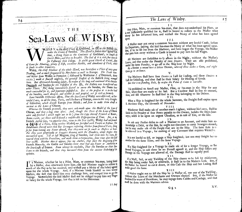 Some Swedish Historians affirm, that the Sea-Laws of Wisby were observed, as Universal Laws, in all the Seas, Parts, and Harbours of Europe, even to the very Straits of Gibralter, which divide Europe from Africa; and seem to make them almost as ancient as the Laws of Oleron.