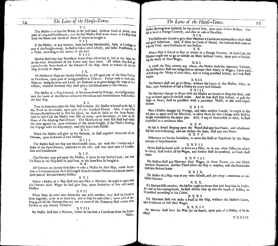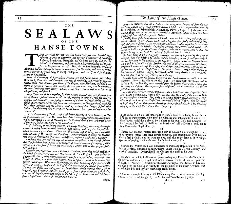 'Tis in this Place likewise that the Deputies of the Hanse-Towns agreed upon Sea-Laws for the Benefit of Navigation, Anno 1597. and that upon the Model of the Laws of Wisby, only with some Additions. For, as the Sea-Laws of Wisby added something to Those of Oleron, so the Laws of the Hanse-Towns improved Those of Wisby. This will appear by the following List, an Abridgement whereof has been presented already (but something imperfect) in the First Part of this Book, Chap. 33.