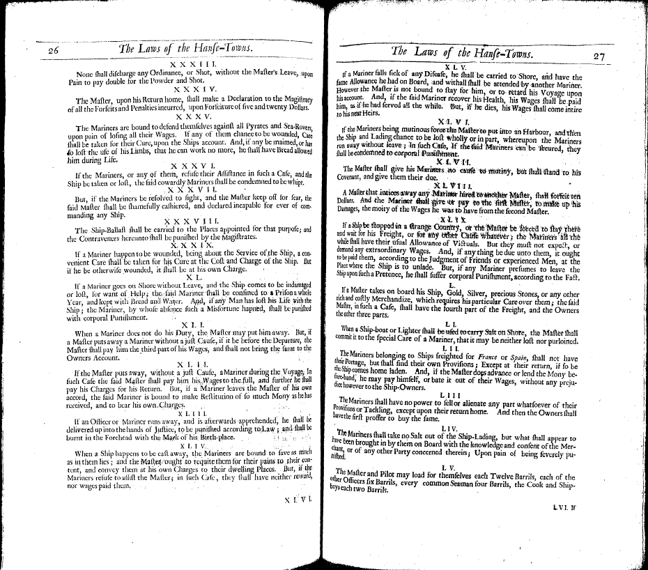 If a Ship be stopped in a strange Country, or the Master be forced to stay there and wair for his Freight, or any other Cause whatever, the Mariners all the while have their usual Allowance and [Victuals]. But they must not expect or demand any extraordinary Wages. And, if any thing be due unto them, it ought to be paid to them, according to the Judgement of Friends or experienced Men, at the Place where the Ship is to unlade. But, if any Mariner presumes to leave the Ship upon such a Pretence, he shall suffer corporal Puniushment, according to the Fact.